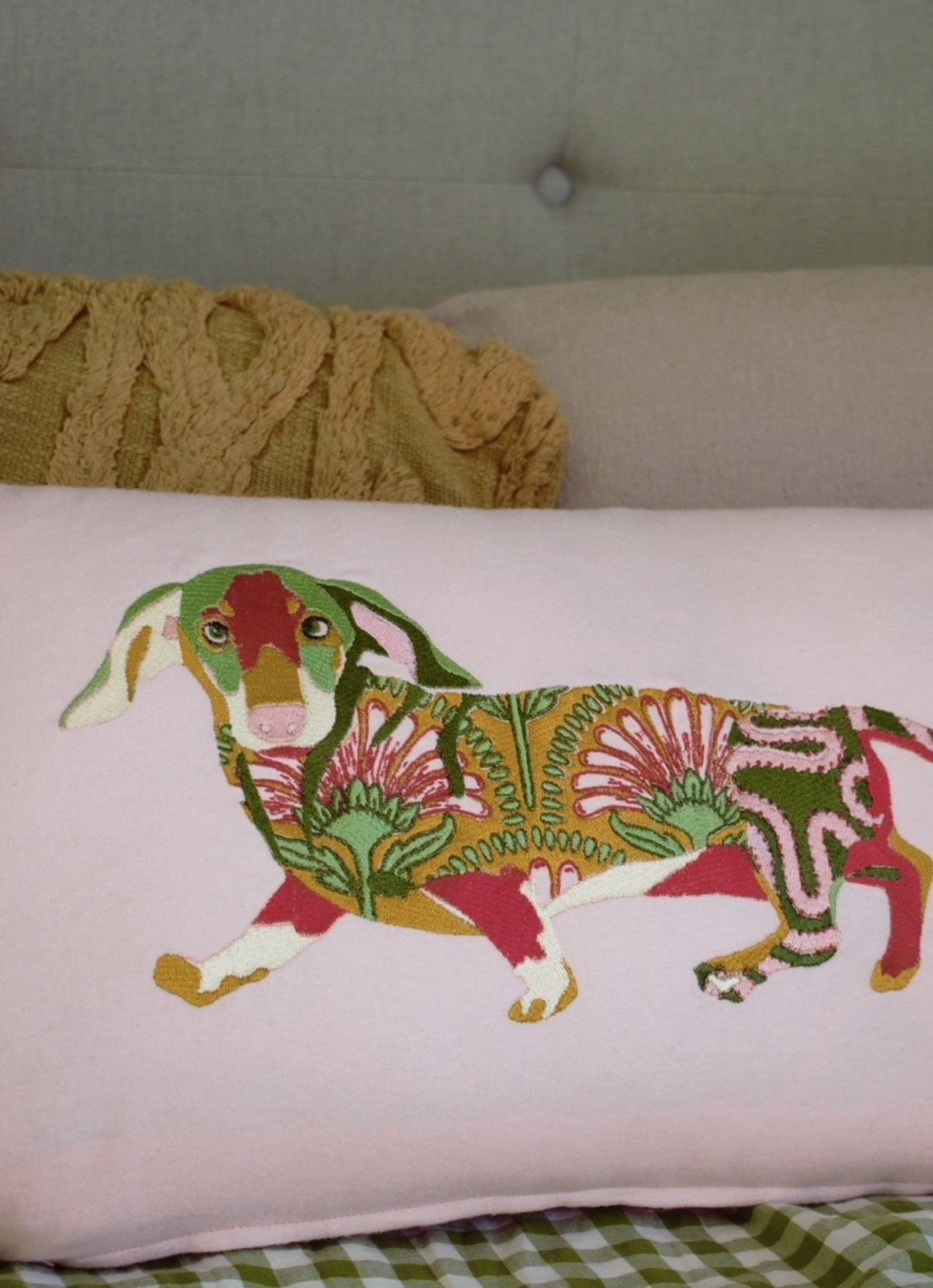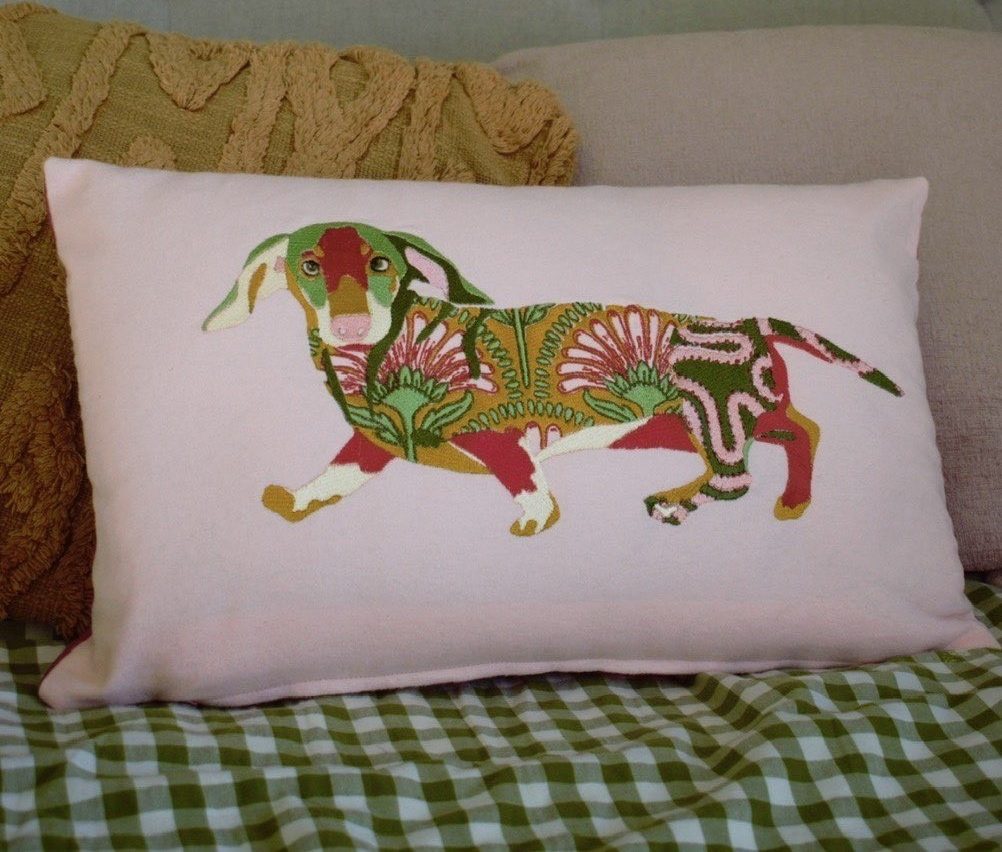 Bring a touch of charm and character to your home with this handcrafted embroidered dachshund cushion cover. Celebrated for its long, low silhouette and curious nature, the dachshund is captured in expressive detail through carefully layered stitching on a baby pink cotton canvas. The playful yet refined design makes this cushion a standout piece, perfect for adding personality to a sofa, reading chair or bed.