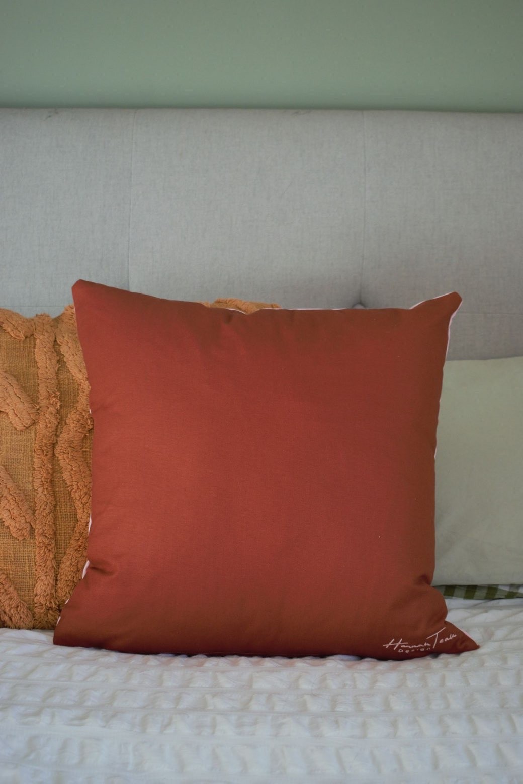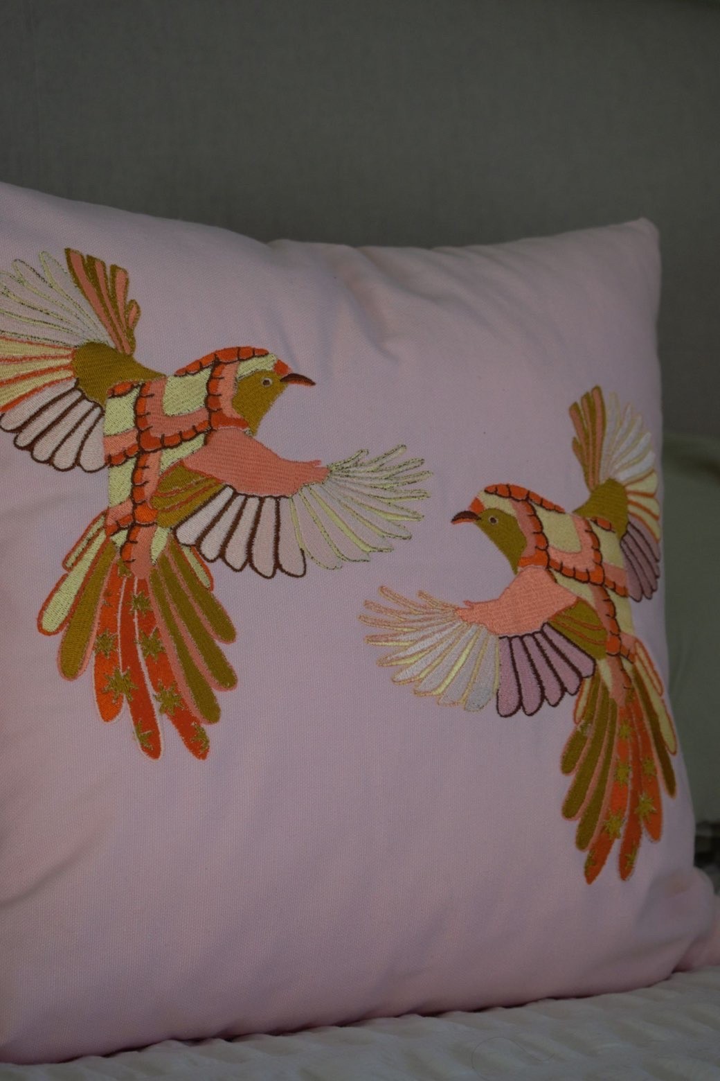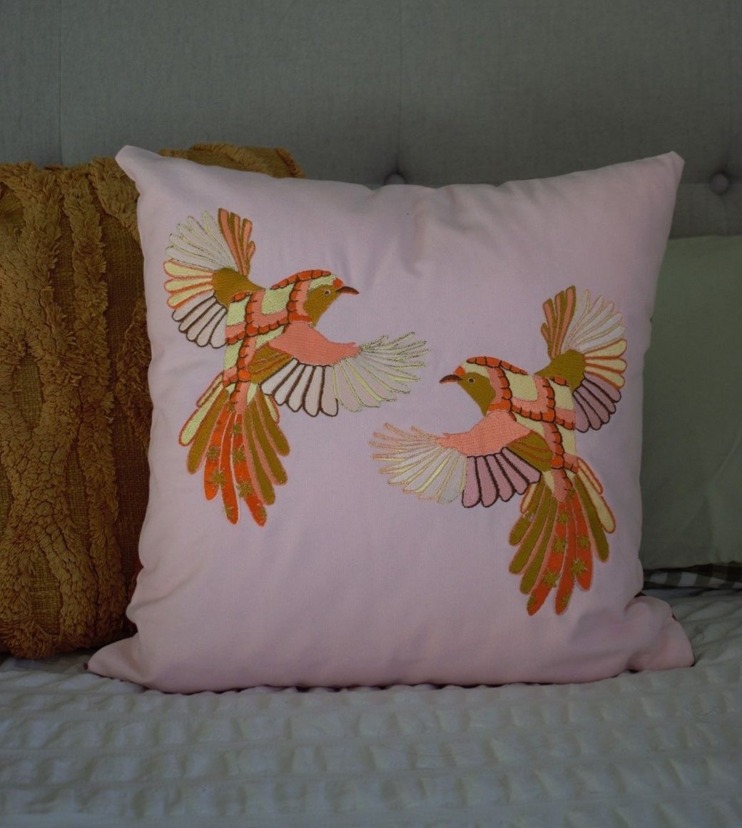 Bring a sense of quiet beauty to your home with this handcrafted embroidered nightingale cushion cover. Known for its melodic song and delicate presence, the nightingale is rendered in fine, detailed stitching on a soft pink cotton canvas. Subtle colourwork and thoughtful embroidery create a peaceful, refined design that adds warmth and serenity to sofas, armchairs or bedroom settings.